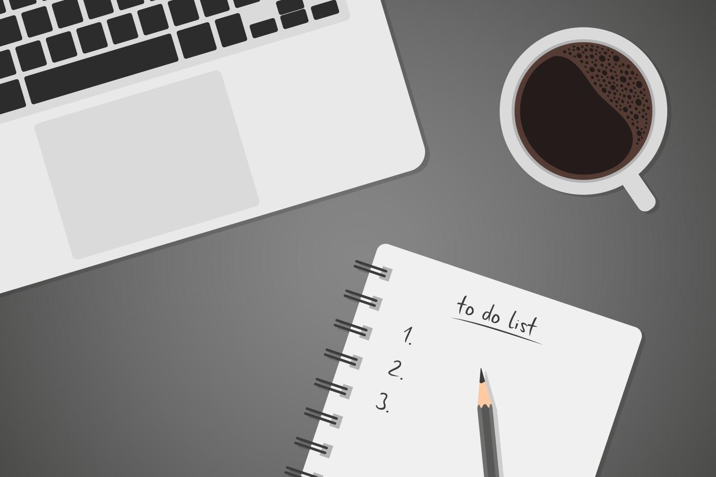 Worktable top view with laptop, coffee and to do list, notebook Pro Vector