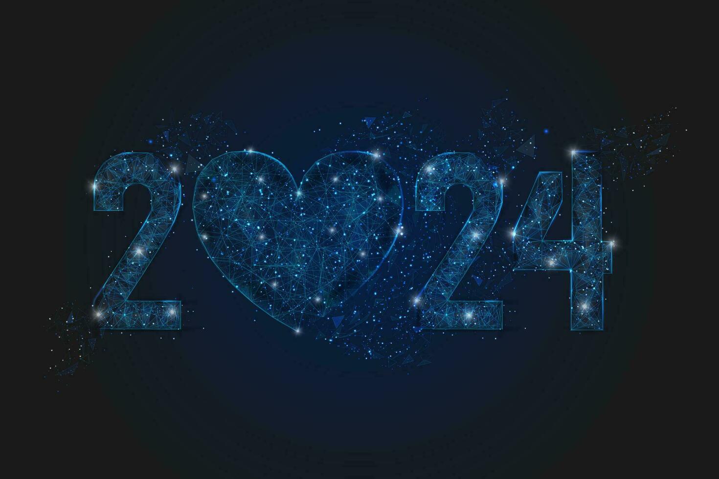 Abstract isolated blue image of new year number 2024. Polygonal low poly wireframe illustration looks like stars in the blask night sky in spase or flying glass shards. Digital web, internet design. Pro Vector