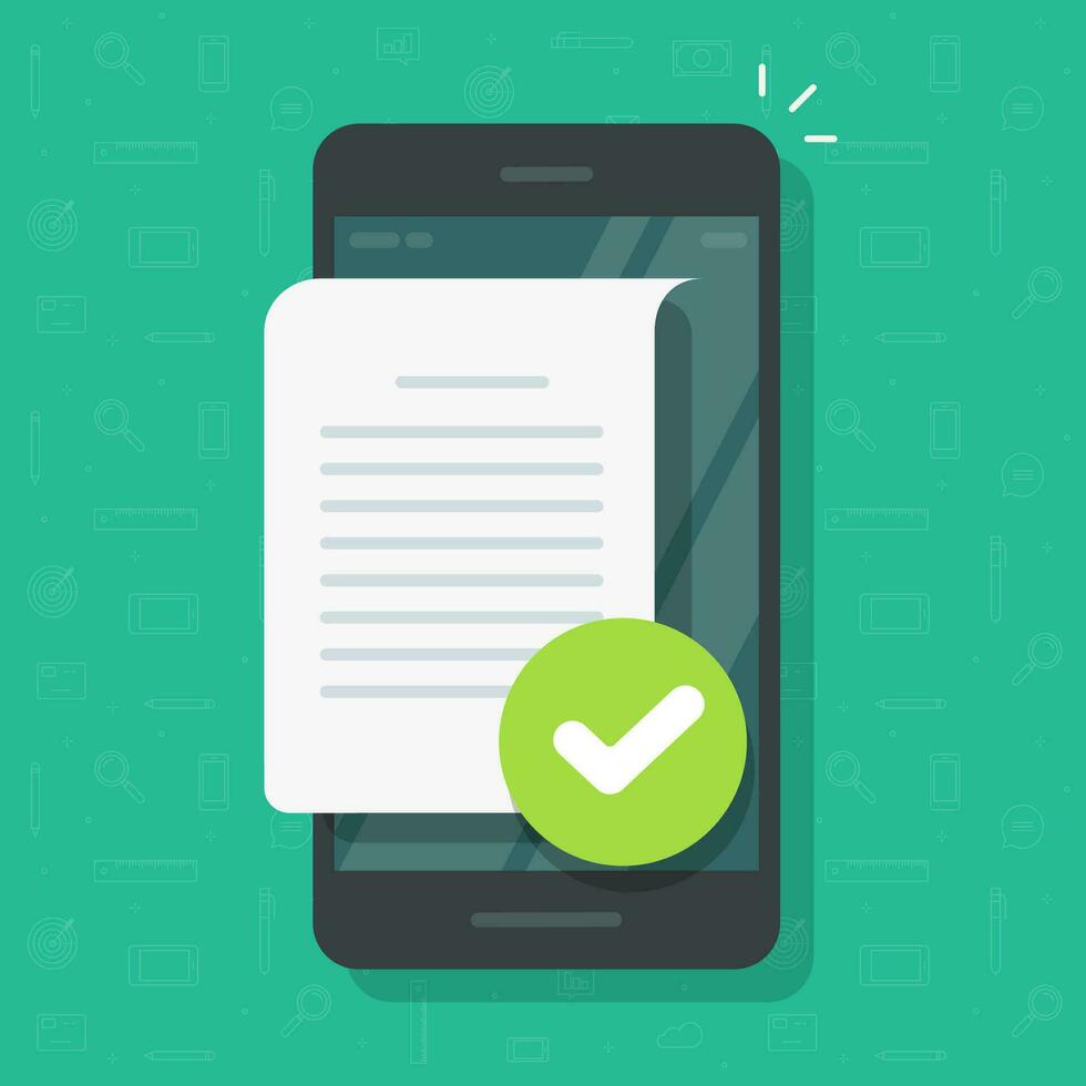 Document file page with checkmark on mobile phone or text file note confirmed with tick on cellphone vector illustration, flat cartoon smartphone with text page or message notification approved image Pro Vector