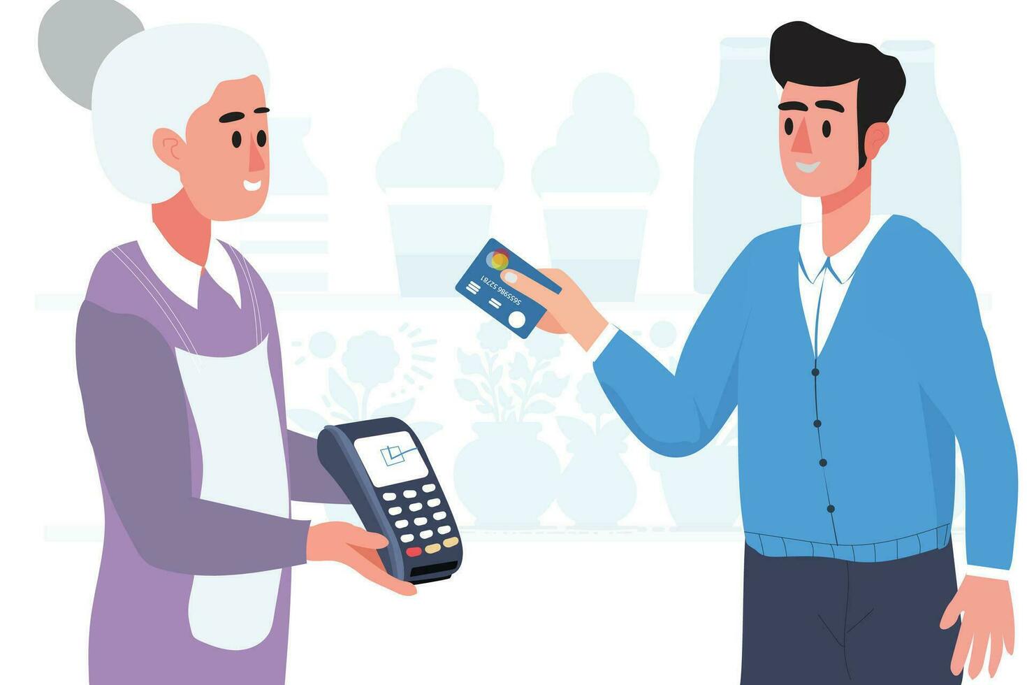 Customers using the contactless payment NFC technology of the digital banking concept. Pay by credit card with machine in store vector on white background Pro Vector