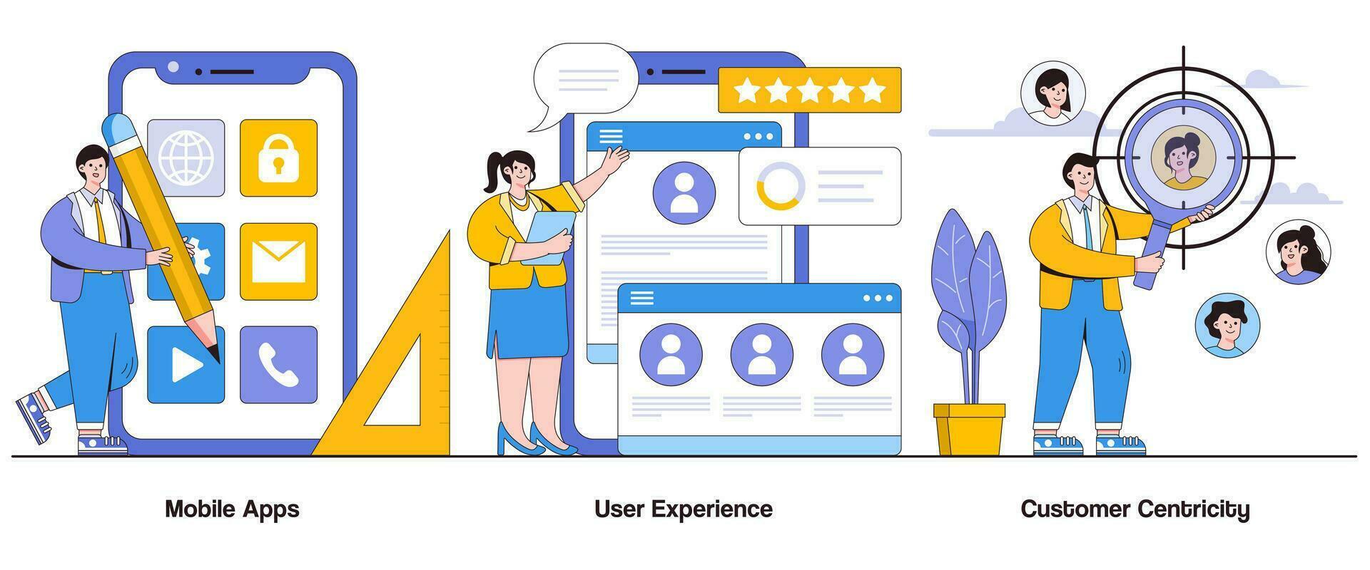 Mobile apps, user experience, customer centricity concept with character. Business interaction abstract vector illustration set. Seamless navigation, user interface, personalized solutions metaphor Pro Vector