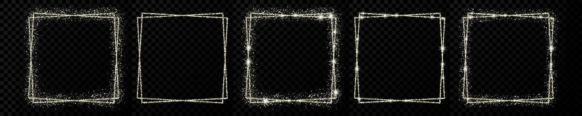 Set of five silver double square frames. Modern shiny frame with light effects isolated on dark background. Vector illustration. Pro Vector