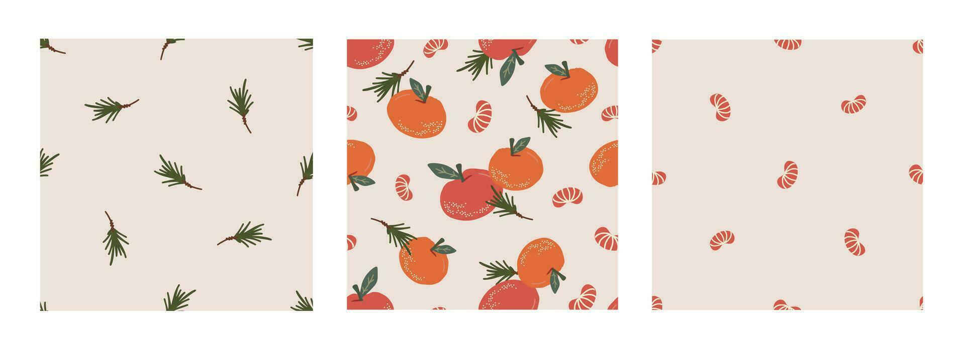Vector seamless pattern set with tangerine, fir twig on beige background. Merry Christmas and New Year symbol texture. Hand drawn festive design for textile, wrapping, prints, wallpaper Pro Vector