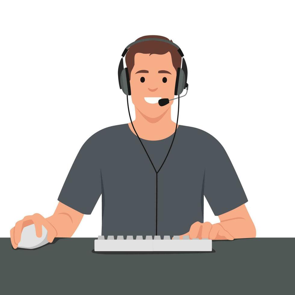 A man plays the computer game front view, wearing headphone and holding mouse. Pro Vector