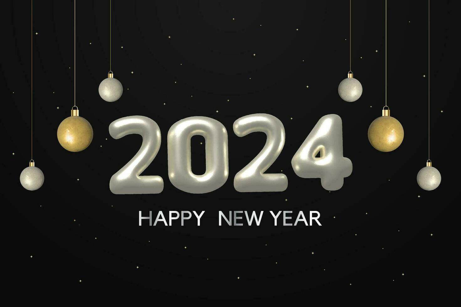 2024 Happy New Year with silver script and hung ball on isolated background Pro Vector