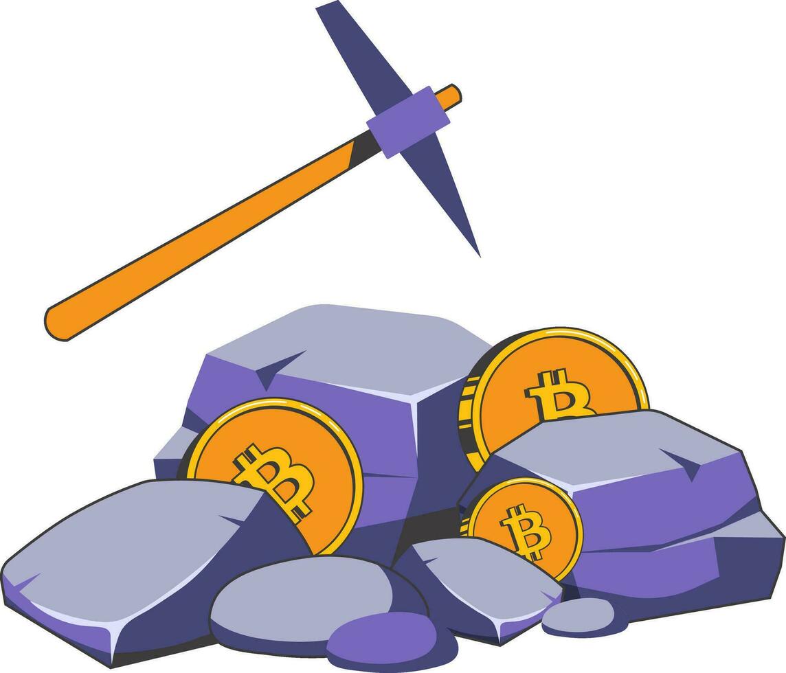 Concept of bitcoin mining. Stones, pickaxe and gold coins. Vector illustration of cryptocurrency mining in retro style Pro Vector