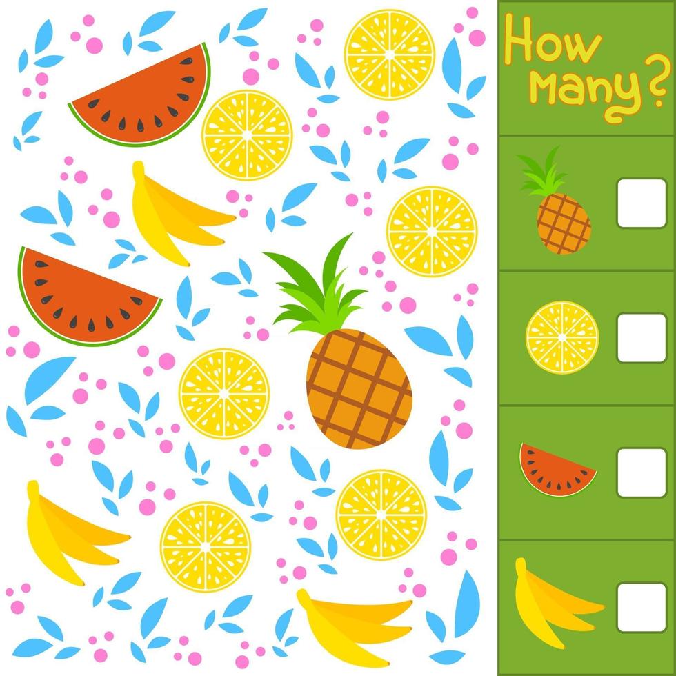 Game for preschool children. Count as many fruits in the picture, write down the result. Banana, watermelon, lemon, pineapple. With a place for answers. Simple flat isolated vector illustration. Pro Vector