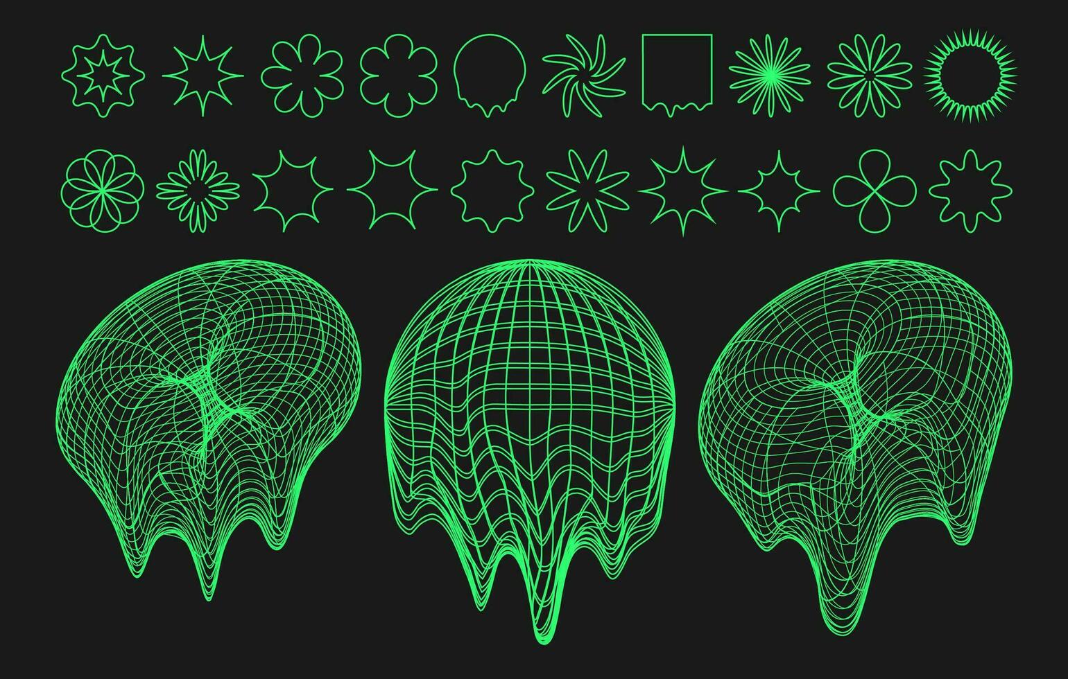 Cyber distorted shapes, retro punk design elements. Melting geometry y2k elements. Isolated wireframe style on black background. Vector trendy illustration. Pro Vector