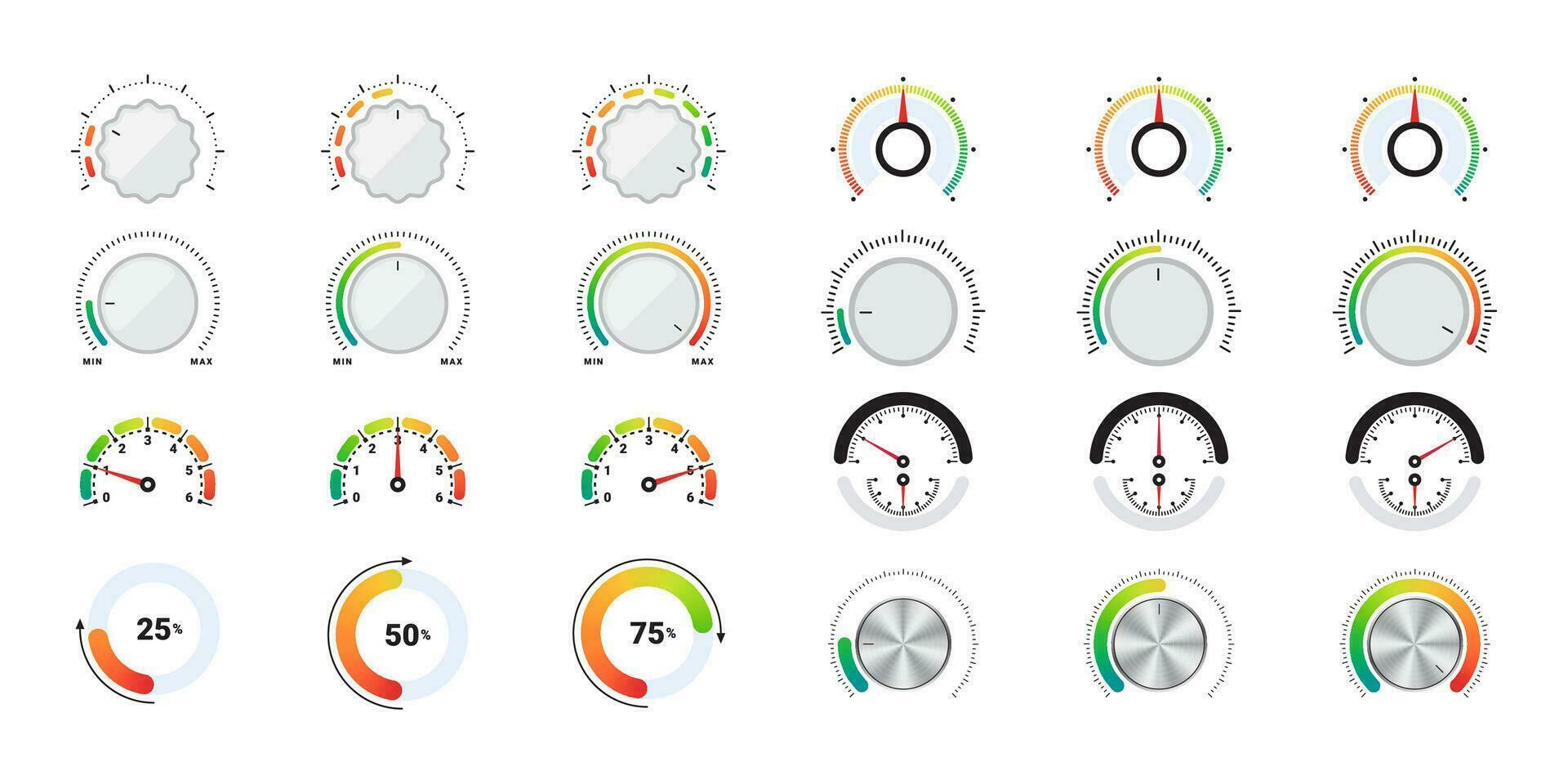 Risk meter icons set. Efficiency meter. Performance measurement. Customer satisfaction. Vector scalable graphics Pro Vector