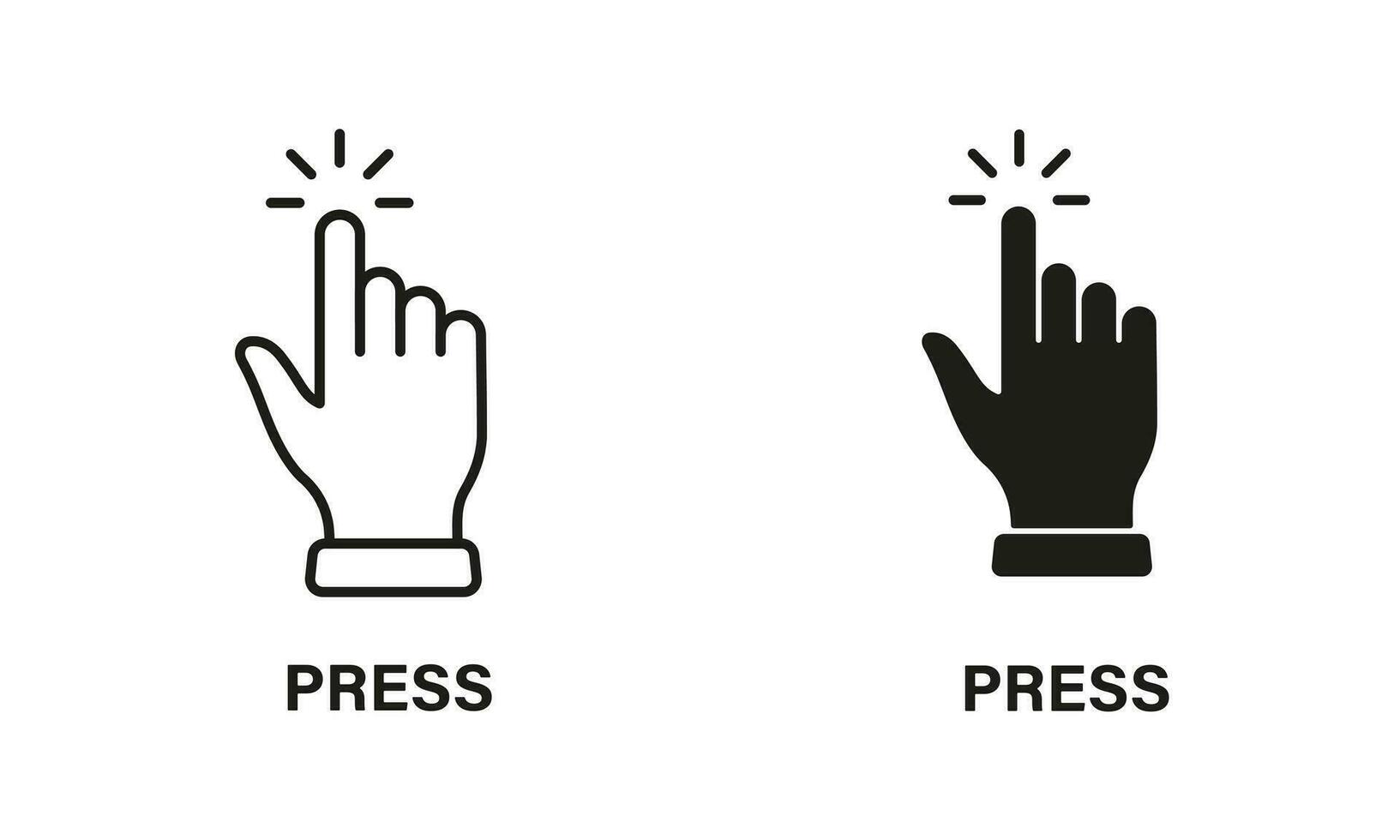 Press Gesture, Hand Cursor for Computer Mouse Line and Silhouette Black Icon Set. Click, Tap, Touch, Point Sign Collection. Pointer Finger Pictogram on White Background. Isolated Vector Illustration. Pro Vector