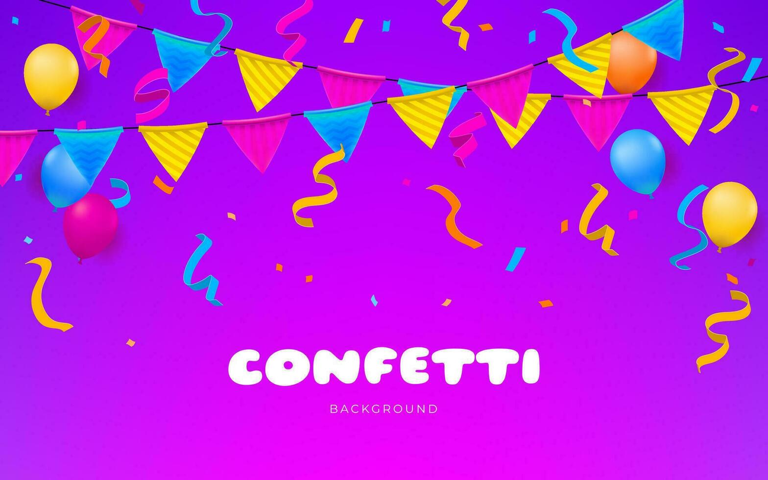 Purple banner with confetti, flags, and balloons, creating atmosphere for a happy birthday. Design perfect for birthday parties, anniversaries, or any joyful event. Not AI generated. vector