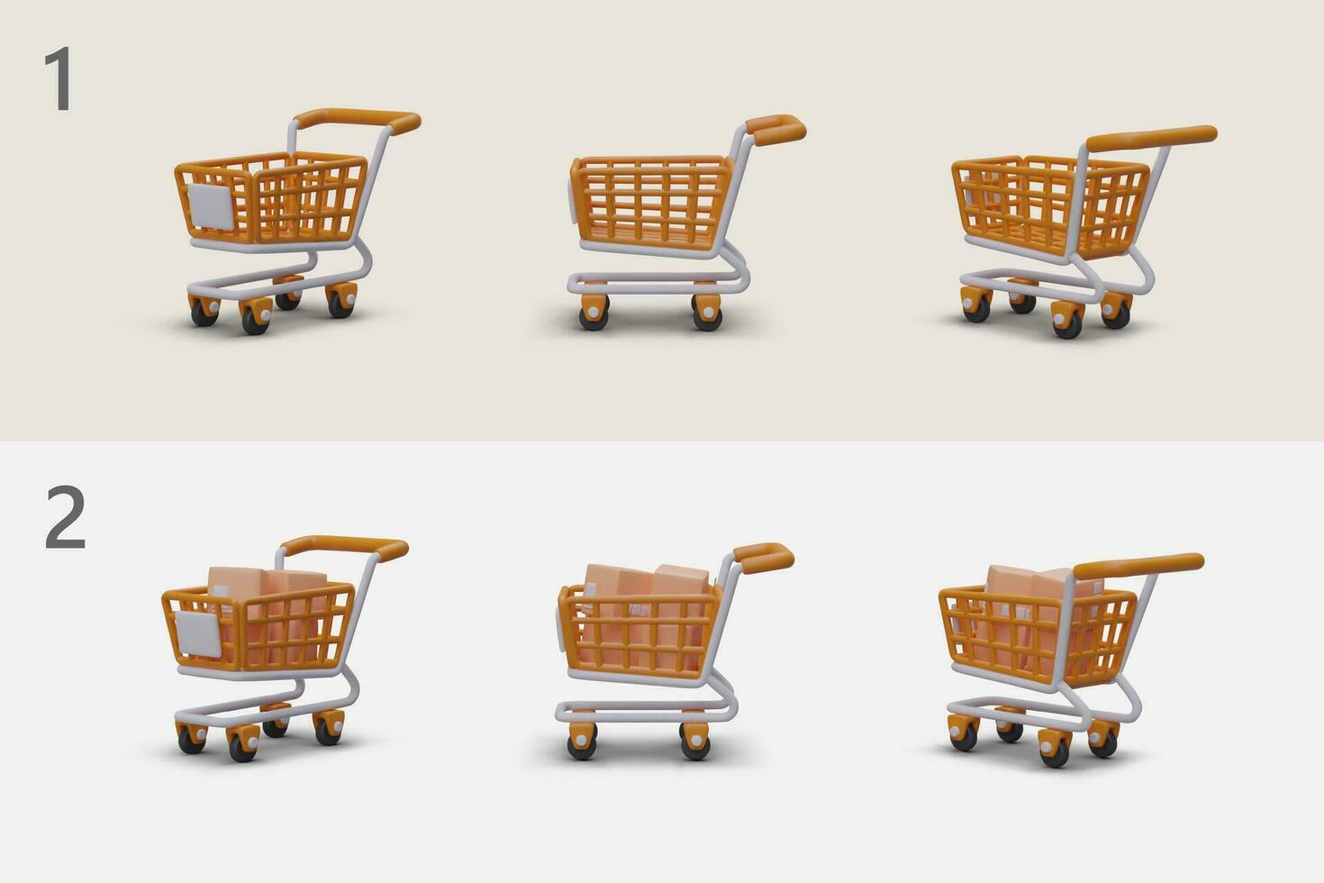 Set of cartoon realistic 3d empty and full shopping carts. Render of cart from different sides Pro Vector