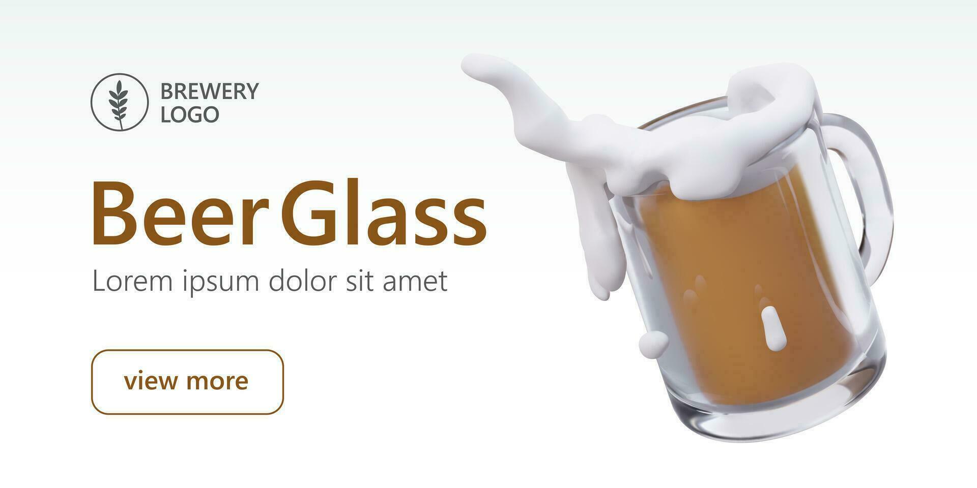 Horizontal template with beer mug and text. 3D drink with white foam splashes out of glass mug Pro Vector