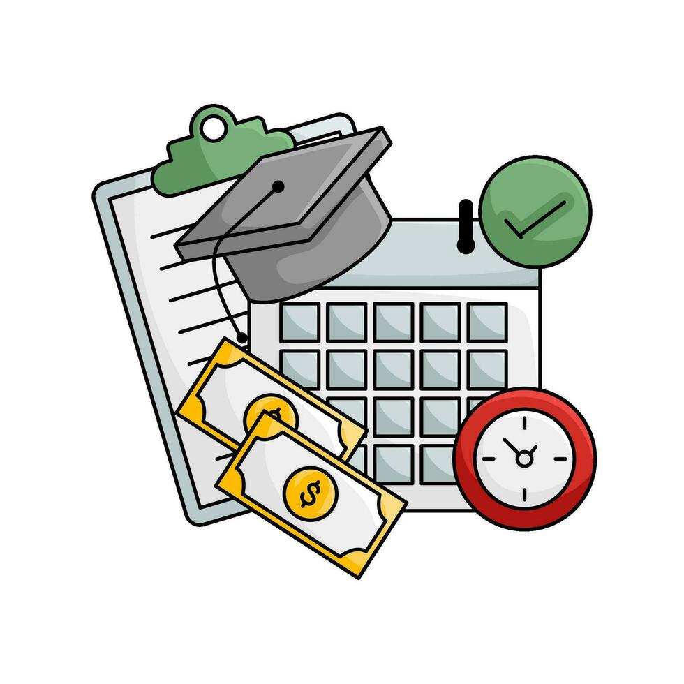 toga hat graduation in calendar, money, clock time, check list in button with document illustration Pro Vector