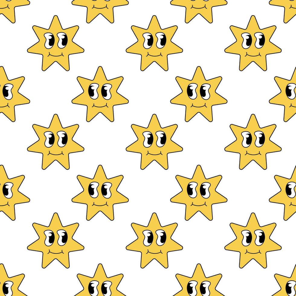 Retro 70s 60s 80s Hippie Seamless Pattern with Groovy Star. Smiling Character. Vector flat background. Pro Vector