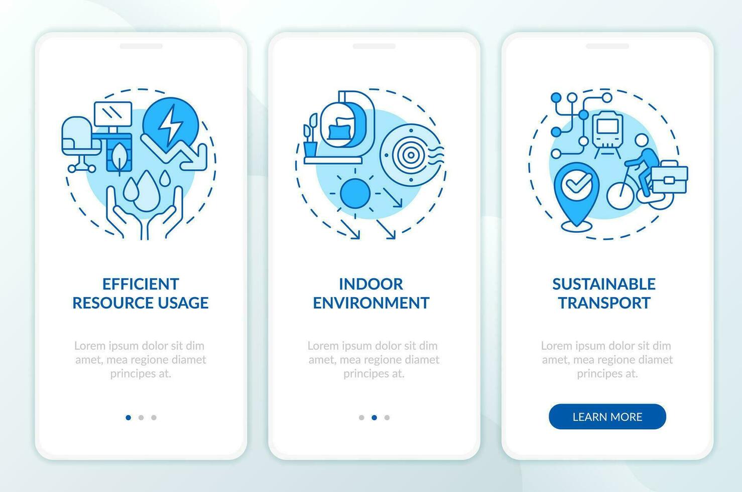 2D blue linear icons representing sustainable office mobile app screen set. 3 steps graphic instructions, UI, UX, GUI template. Pro Vector and Pro SVG