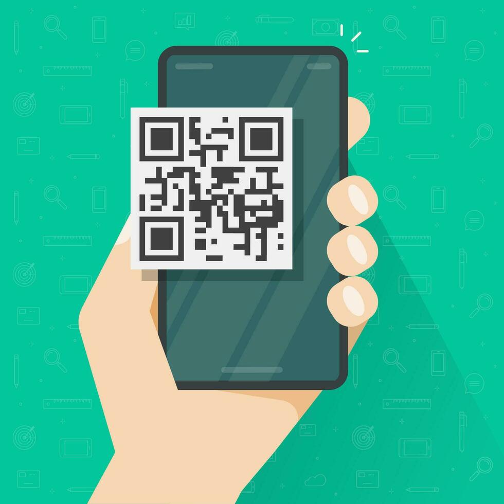 Qr code icon on mobile phone or smartphone screen in person hand vector flat cartoon illustration, cellphone with bar code symbol modern design image Pro Vector