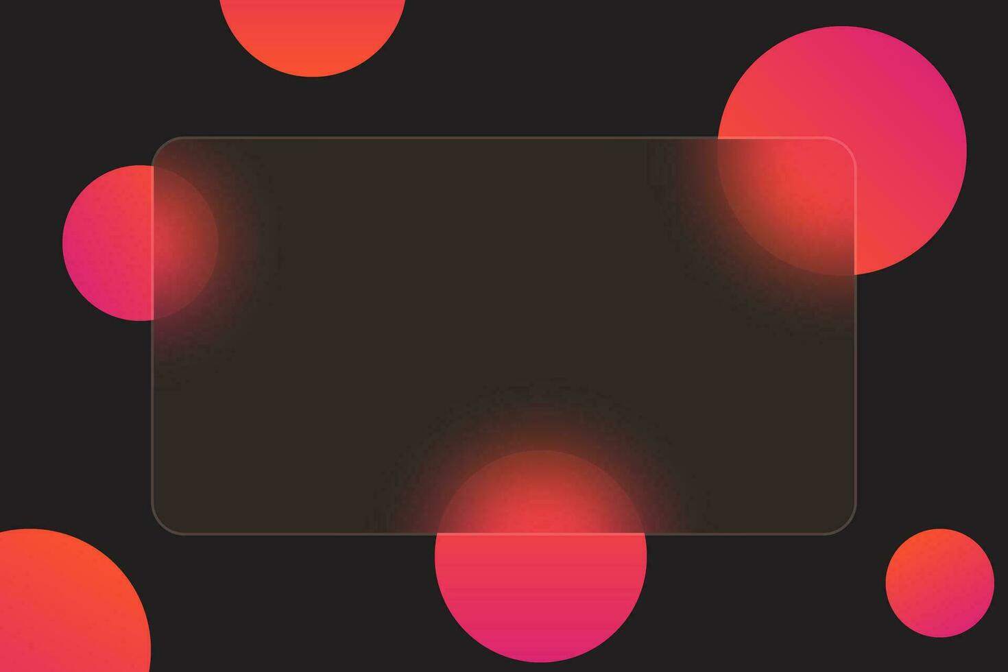 Digital abstract background of bright neon circles with glass morphism rectangular plate in the center. Horizontal modern banner template with translucent frame for text. Vector illustration Pro Vector