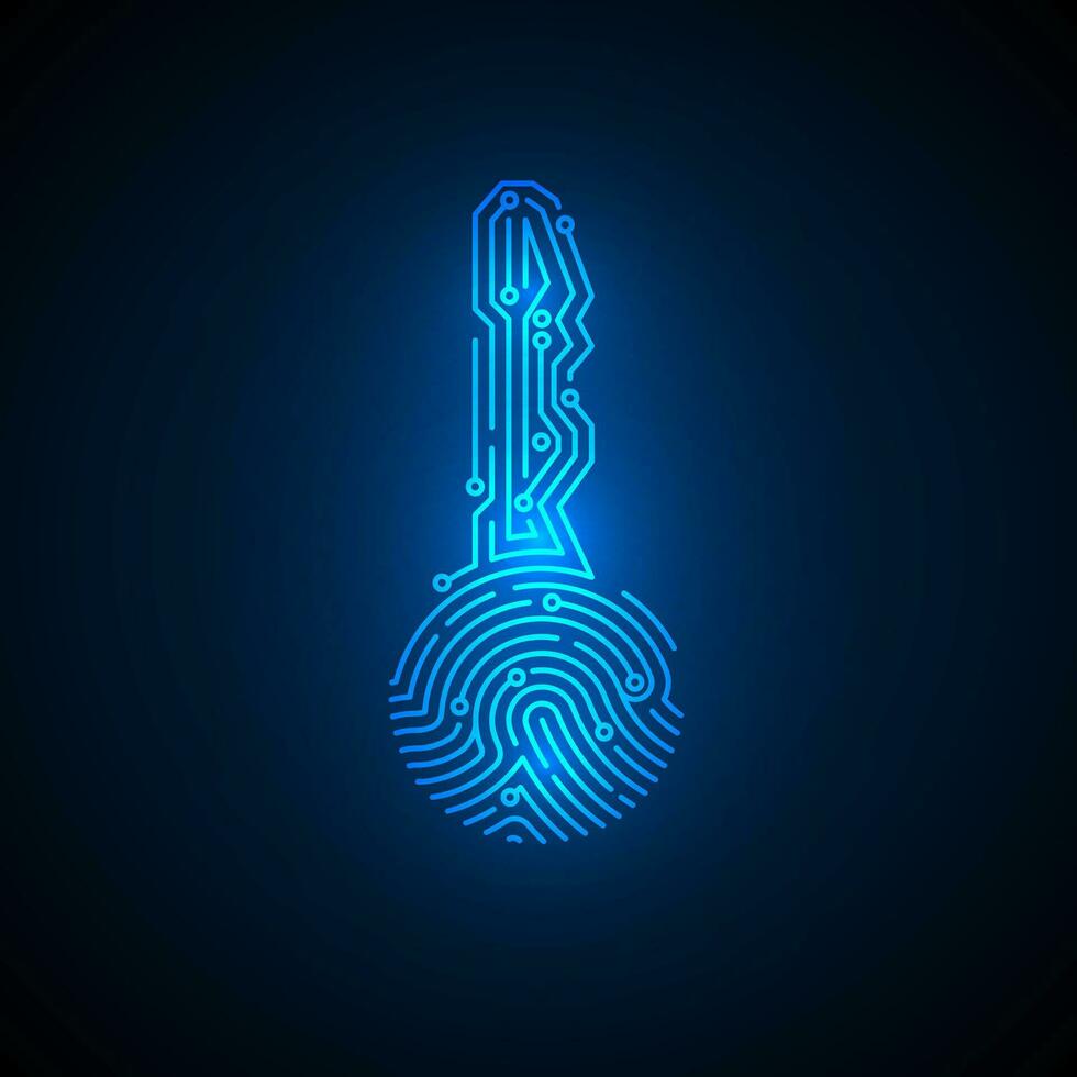 Fingerprint in key shape with circuit background. Cyber security id concept. Security cryptocurrency technology. Authorization futuristic system. Vector illustration Pro Vector