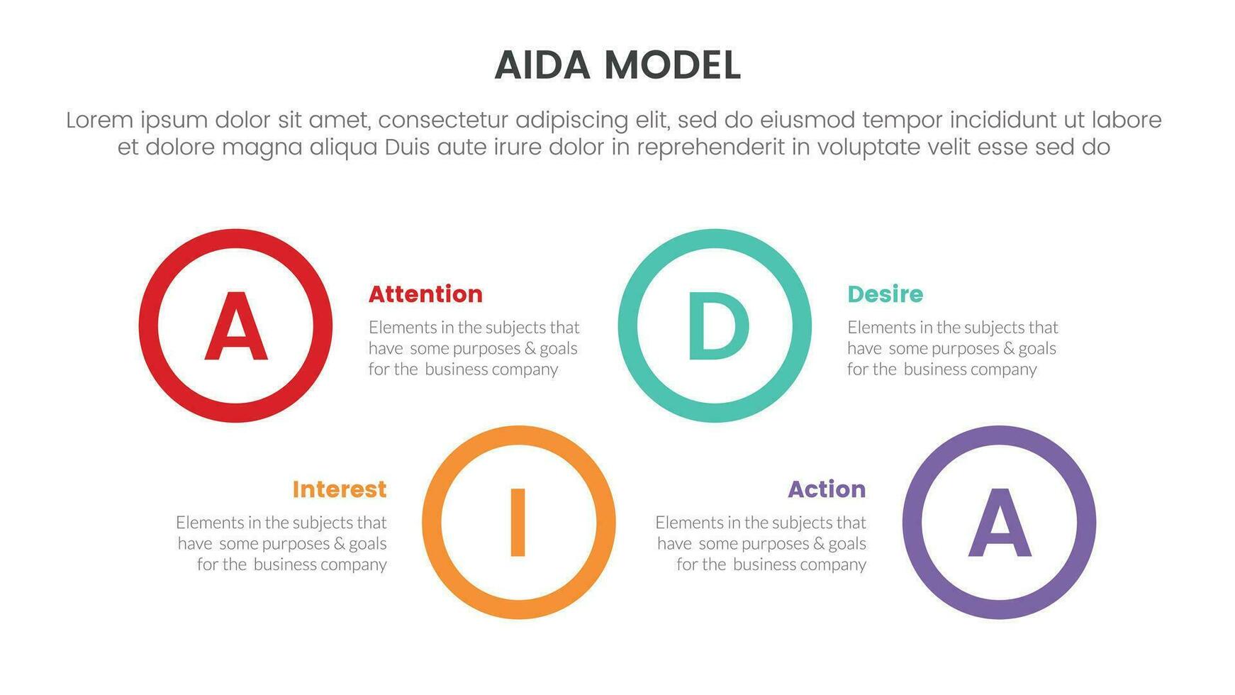 aida model for attention interest desire action infographic concept with big circle shape horizontal 4 points for slide presentation style vector