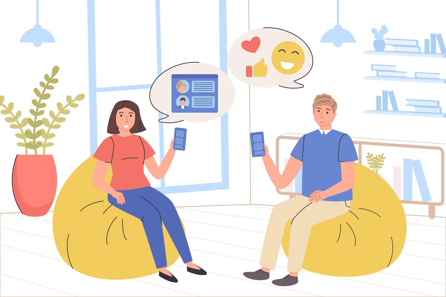 People browse social network concept. Man and woman chats, like photos, write comments, follow bloggers, read posts. Online communication, internet addiction. Vector illustration in trendy flat design Pro Vector