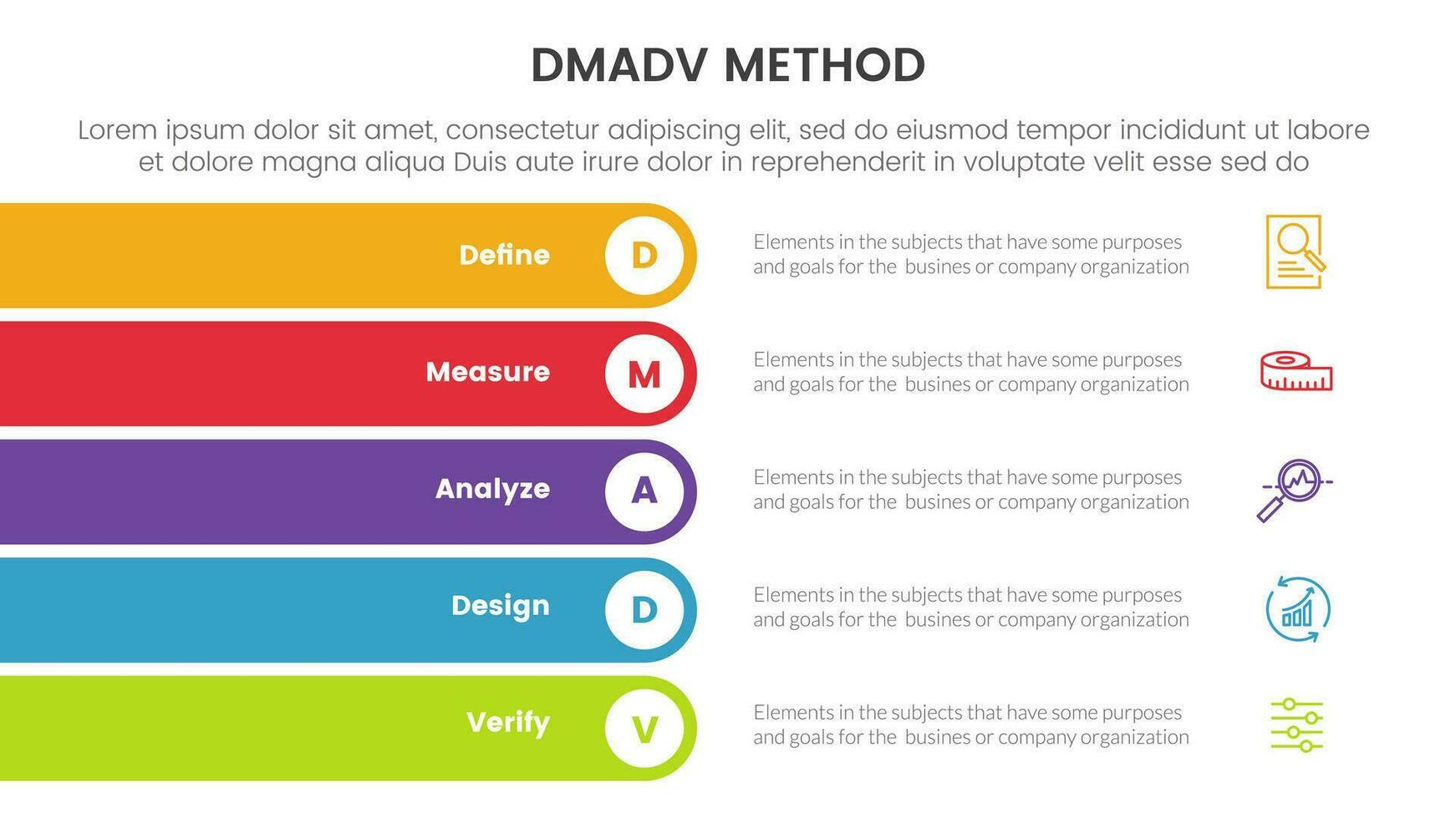 dmadv six sigma framework methodology infographic with rectangle round shape vertical stack 5 point list for slide presentation vector