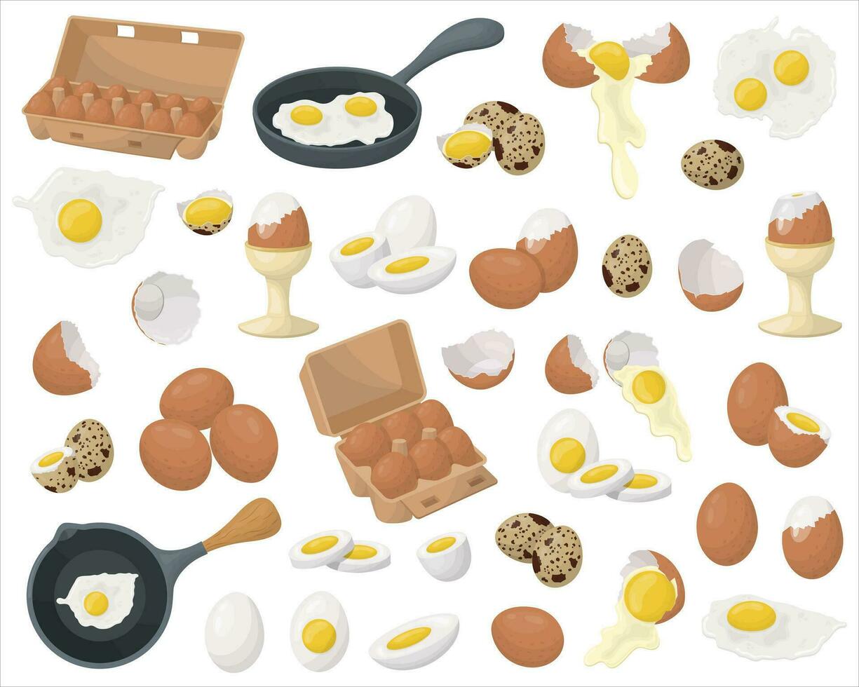 A set of chicken and quail eggs. Fried and boiled eggs, eggs in a frying pan, eggshells. Vector illustration Pro Vector