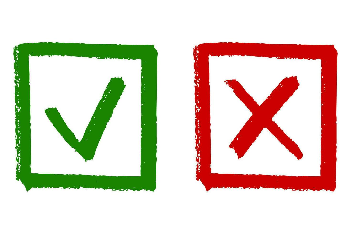 Clipart set of marker checkmarks and red cross in a square frame isolated on a white background. Vector textured grunge elements, to-do list, hand drawn doodle. Free Vector