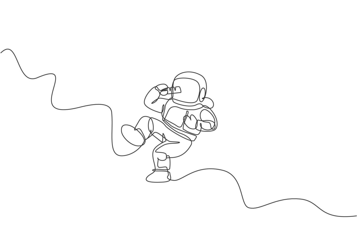 One continuous line drawing of cosmonaut eating sweet milk chocolate bar in galactic universe. Fantasy outer space astronaut life concept. Dynamic single line draw graphic design vector illustration Pro Vector