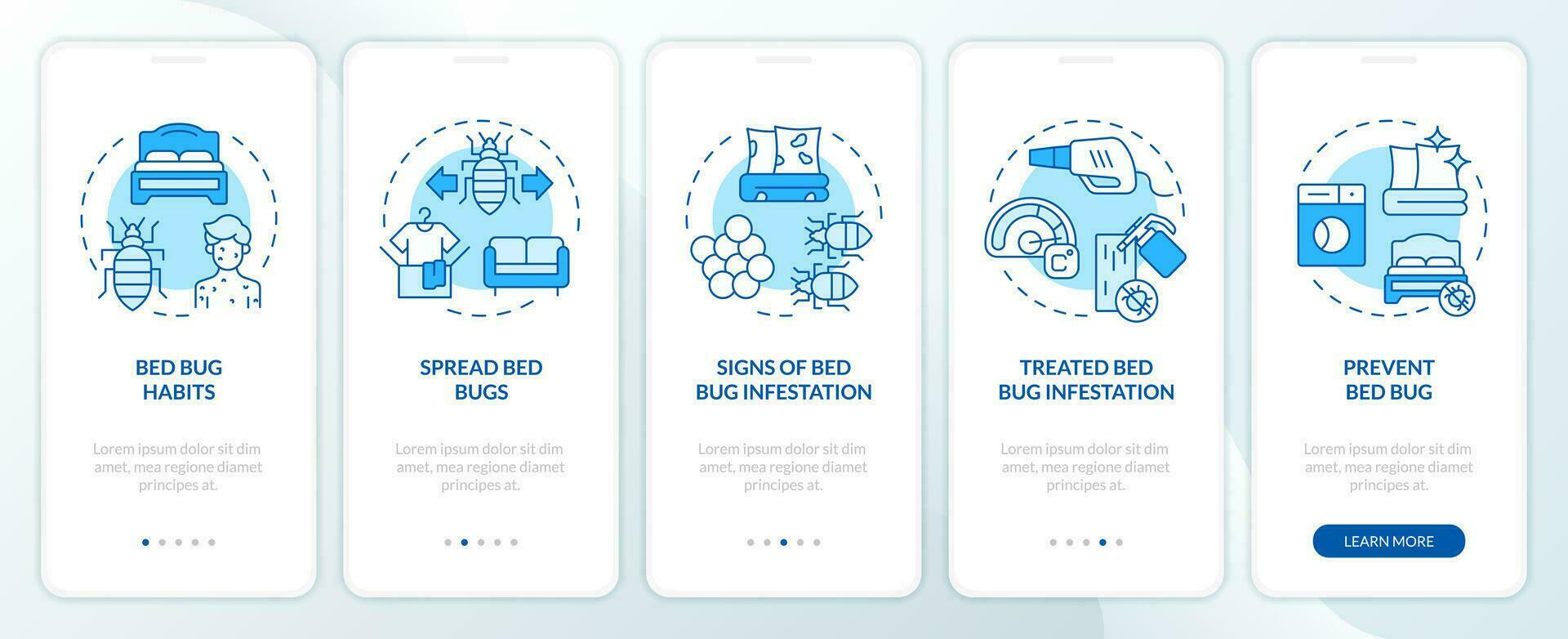 2D icons representing integrated pest management mobile app screen set. Walkthrough 5 steps blue graphic instructions with line icons concept, UI, UX, GUI template. Pro Vector and Pro SVG