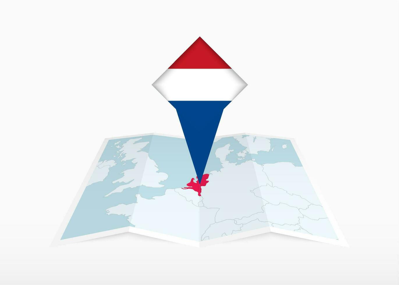 Netherlands is depicted on a folded paper map and pinned location marker with flag of Netherlands. Pro Vector