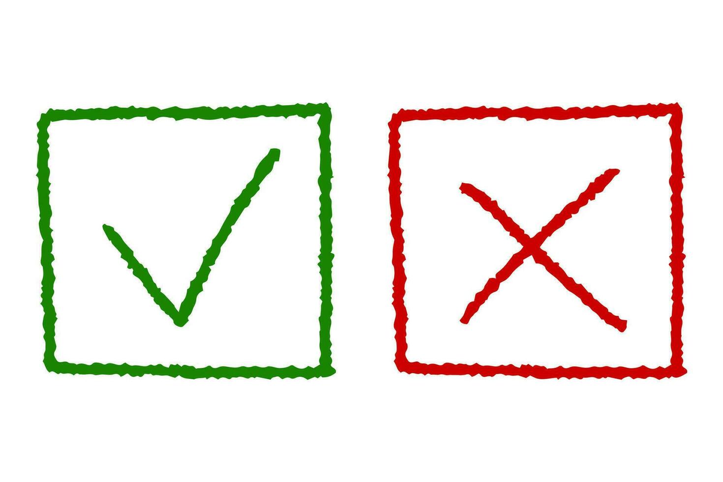 Clipart set of thin minimalistic checkmark and red cross in a square frame isolated on a white background. Vector textured grunge elements, to-do list, hand drawn doodle. Free Vector