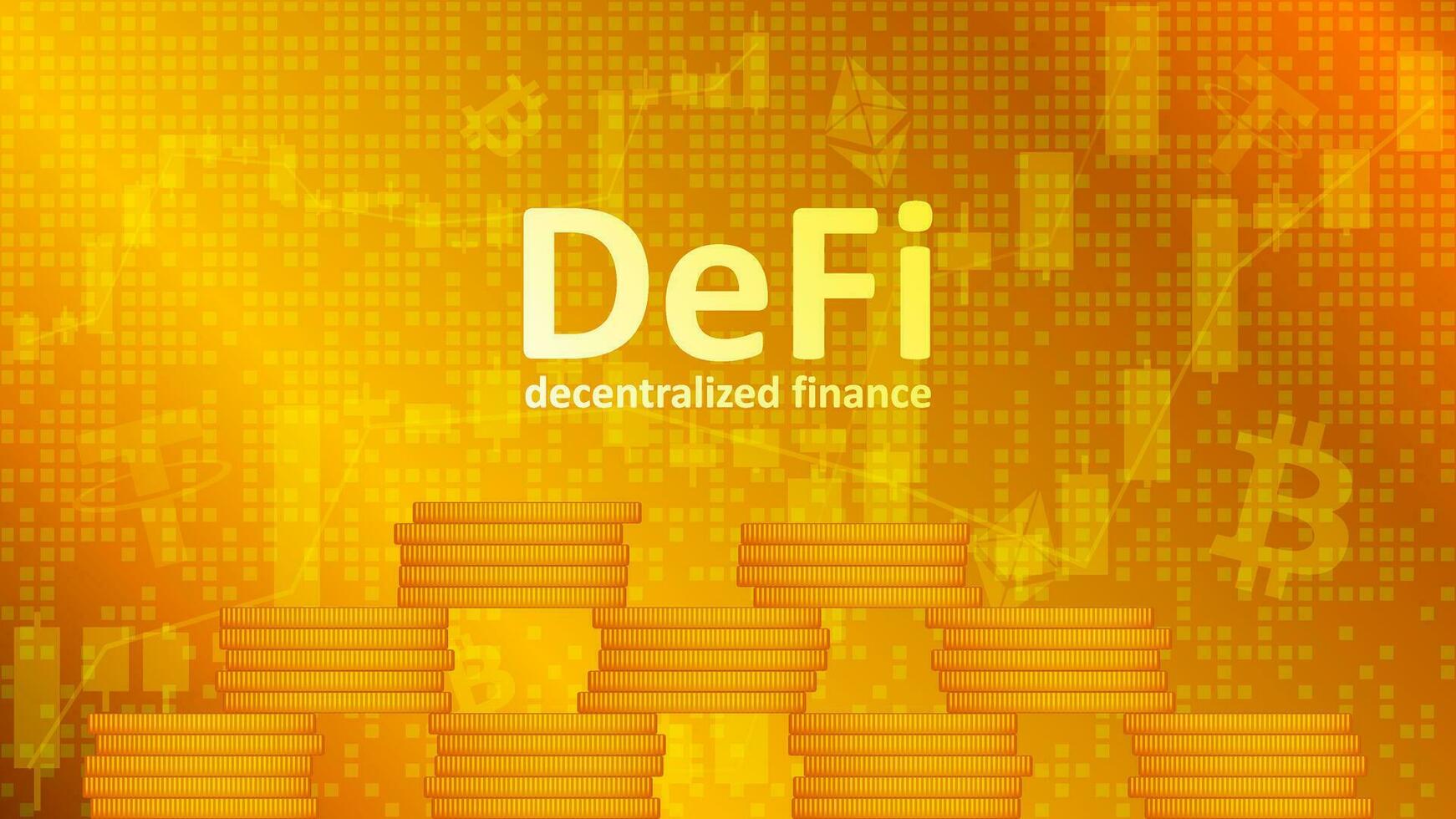 Defi decentralized finance with pyramid of coins on golden background with graphs. An ecosystem of financial applications and services based on public blockchains. Vector EPS 10. Pro Vector