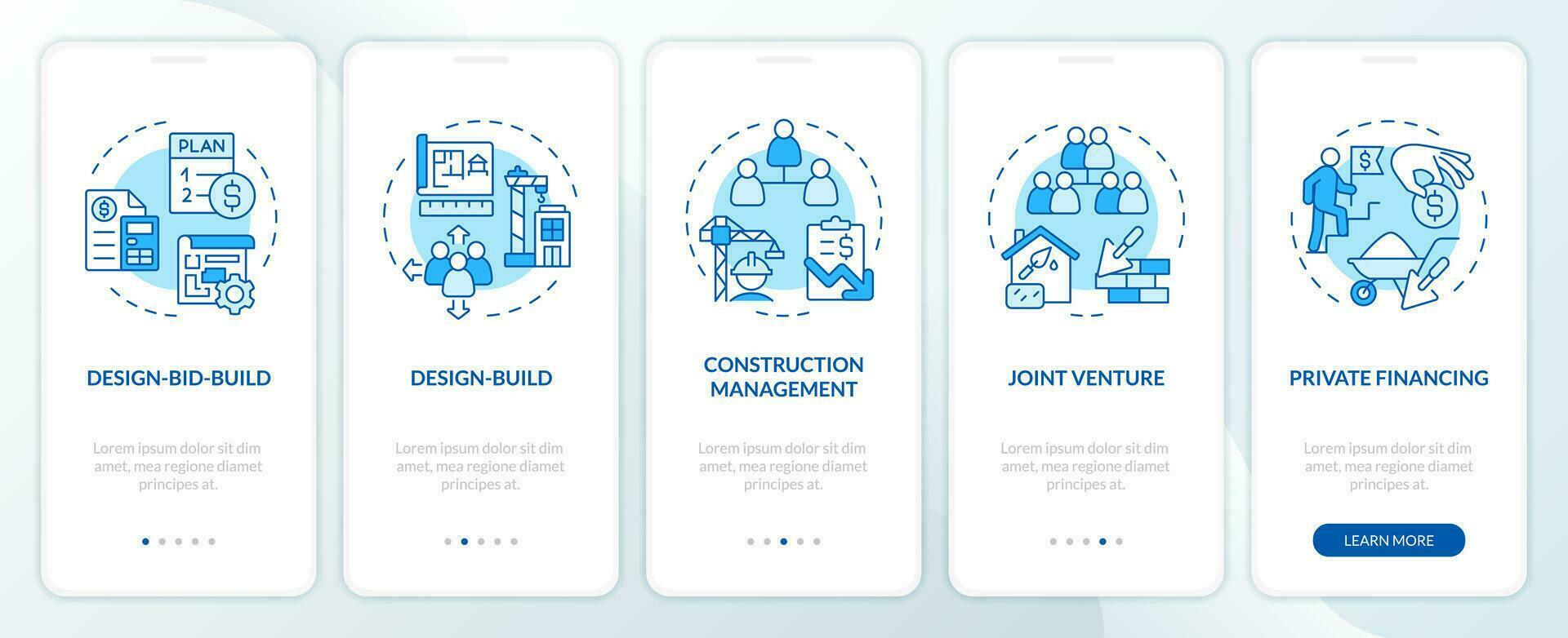 2D blue icons representing construction cost mobile app screen set. Walkthrough 5 steps monochromatic graphic instructions with linear icons concept, UI, UX, GUI template. Pro Vector and Pro SVG