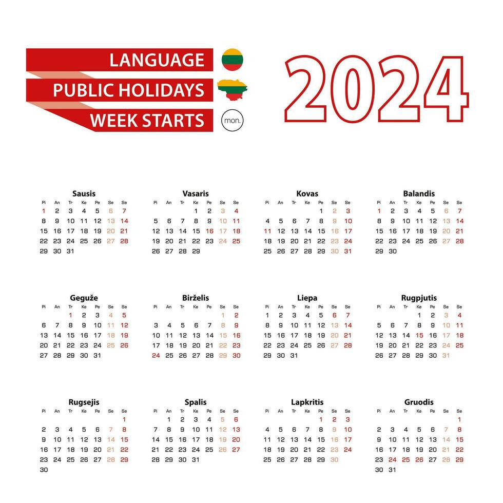 Calendar 2024 in Lithuanian language with public holidays the country of Lithuania in year 2024. Pro Vector