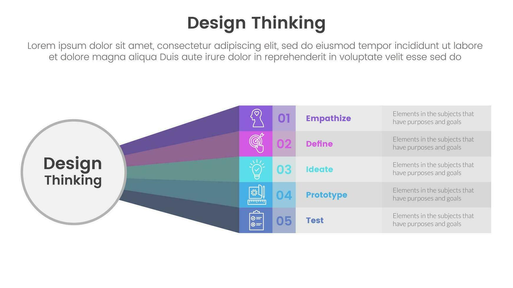 design thinking process infographic template banner with big circle and rainbow long rectangle shape with 5 point list information for slide presentation Pro Vector
