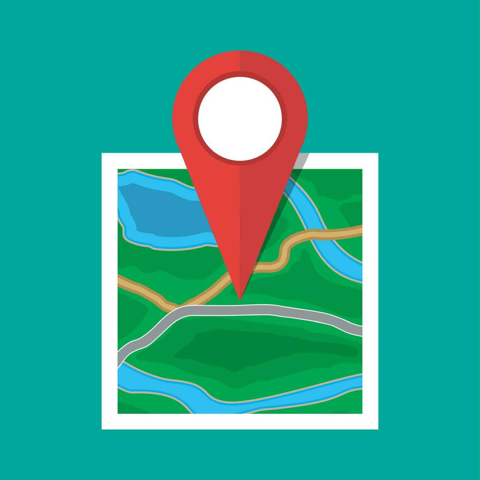 Abstract square generic city or suburb map with roads, buildings, parks, river. Map with red marker pin. Vector illustration in flat style Pro Vector