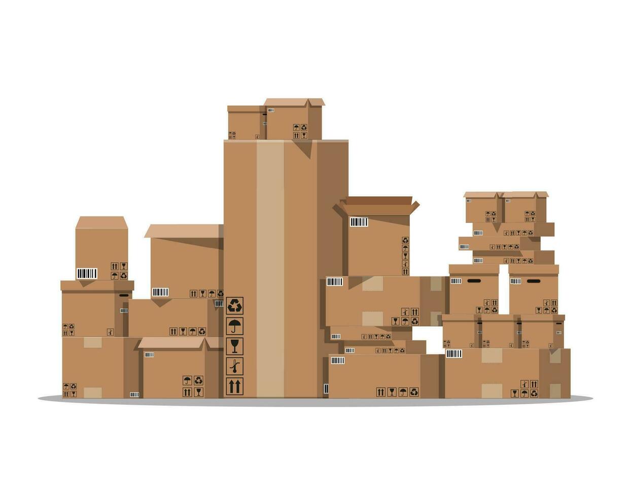 Pile cardboard boxes set. Carton delivery packaging open and closed box with fragile signs. Vector illustration in flat style Pro Vector