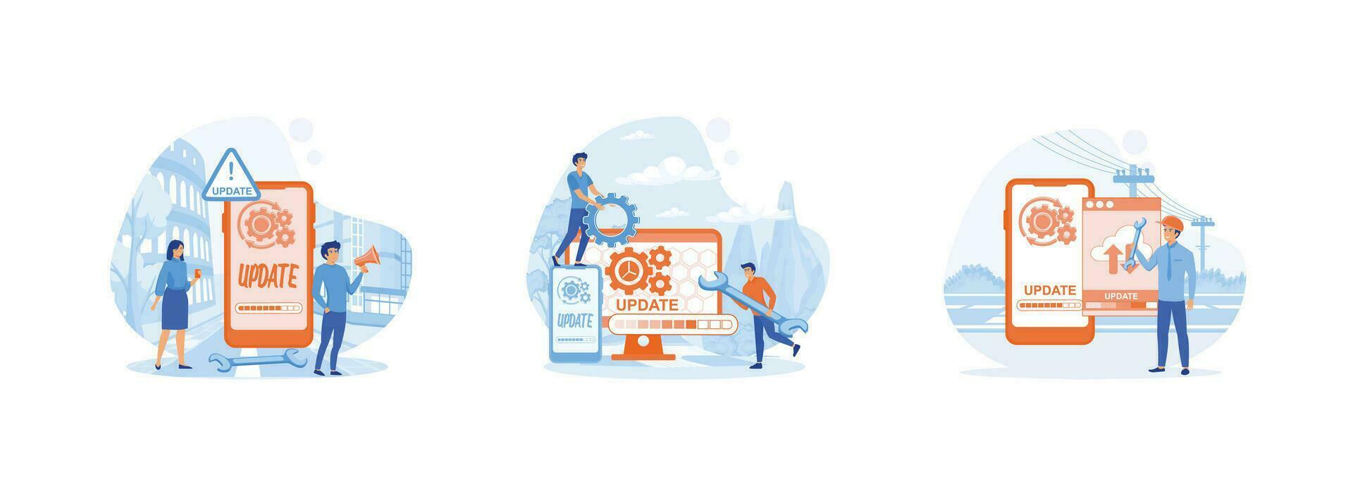 Cartoon software update people for mobile app design, update software mini people work with upgrade system, update process, install software. Software update set flat vector modern illustration Pro Vector