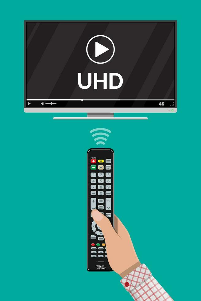 Modern flat screen tv with ultra high definition, 4k screen format. Tv with onine player. Led television display. Hand with remote control. Vector illustration in flat style Pro Vector