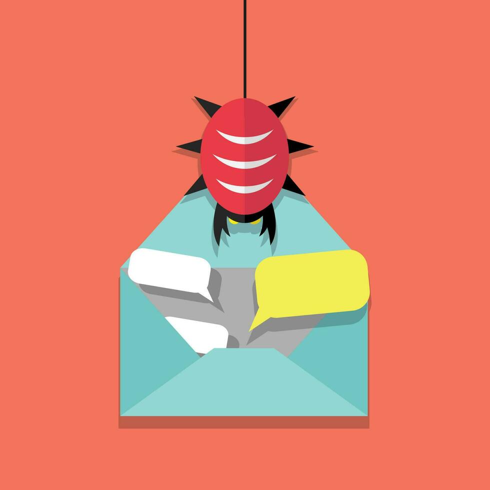 Infected email icon. opened mail and virus malware bug. vector illustration in flat design on red background Pro Vector
