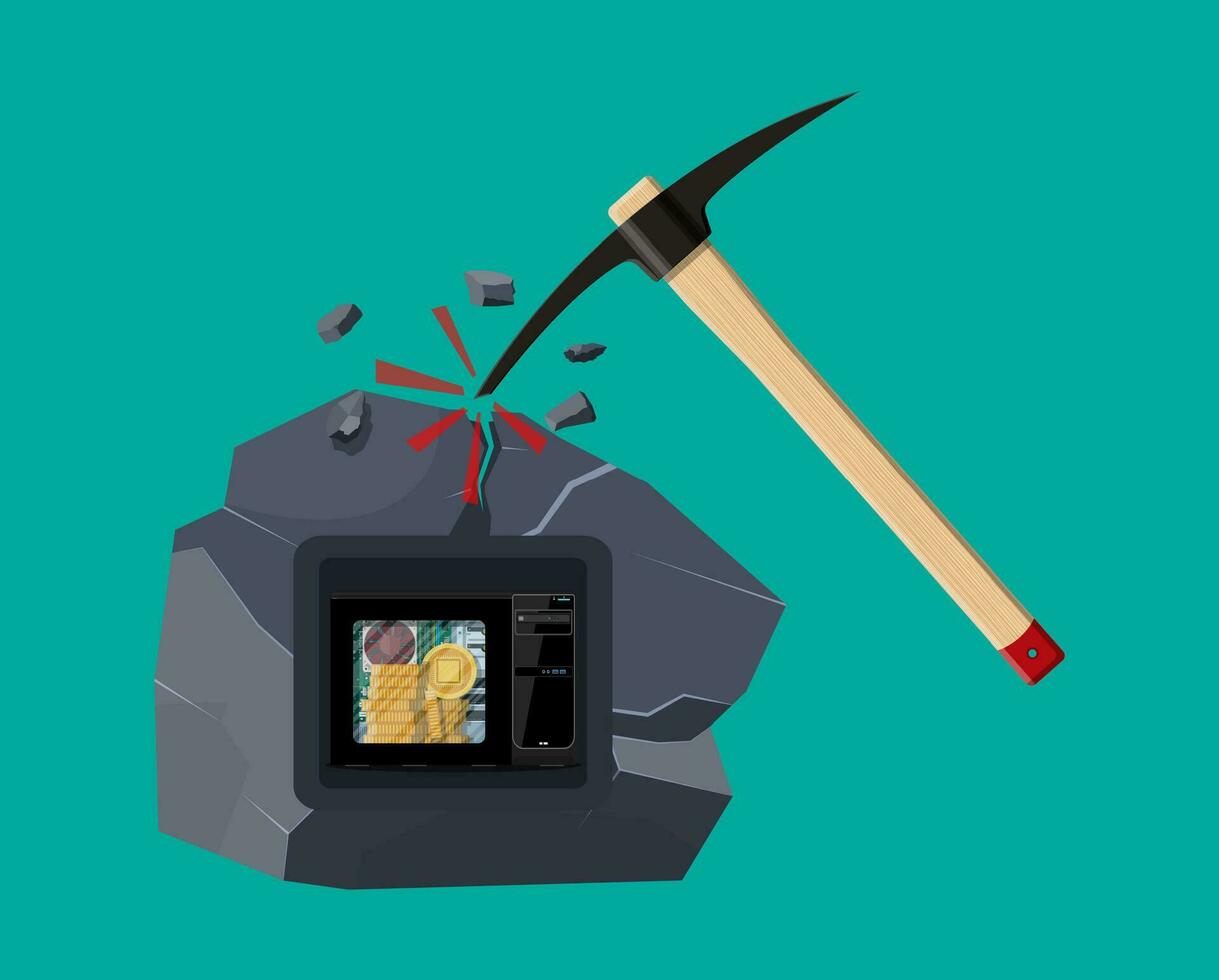 Golden coin with computer chip and pickaxe. Mining symbol. Money and finance. Digital currency. Virtual money, cryptocurrency and digital payment system. Vector illustration in flat style Pro Vector