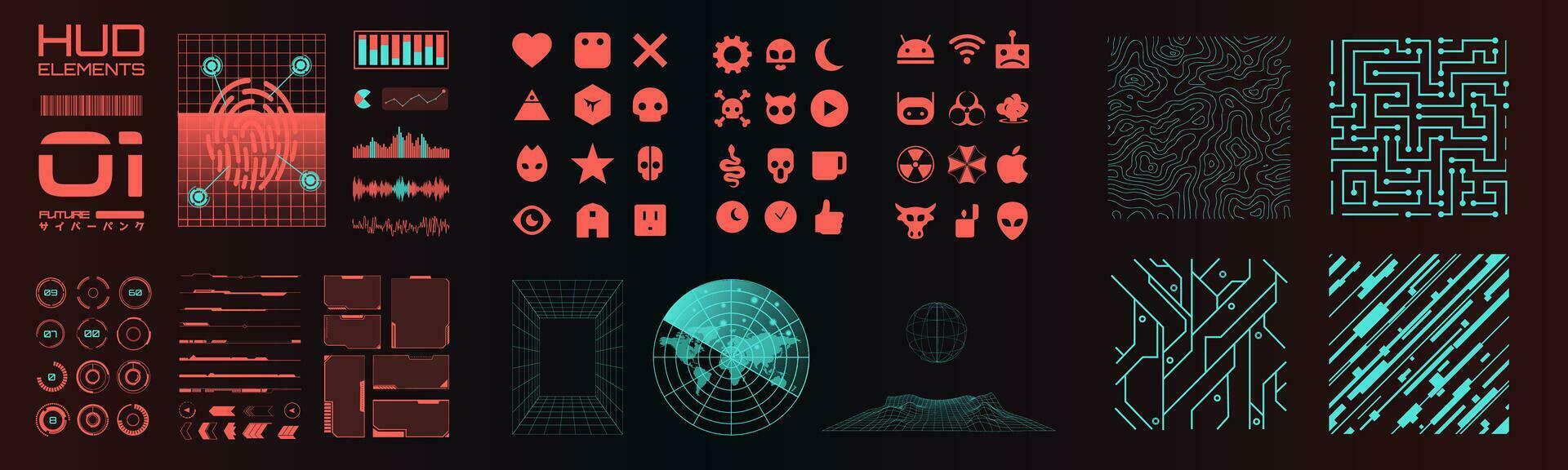 Cyberpunk 3D Cosmic Shapes. Digital Hud elements. Info, label boxes and bars. UI, UX futuristic parts for layouts and templates. Holograms, charts and virtual reality visualizations. Video game maps. Pro Vector