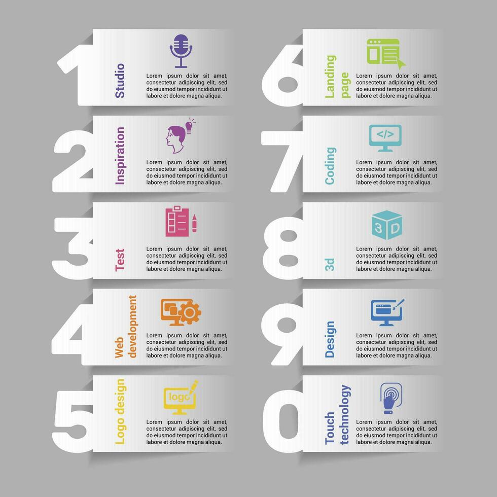 Infographics with Creative Package theme icons, 10 steps. Such as studio, inspiration, test, web development and more. Pro Vector