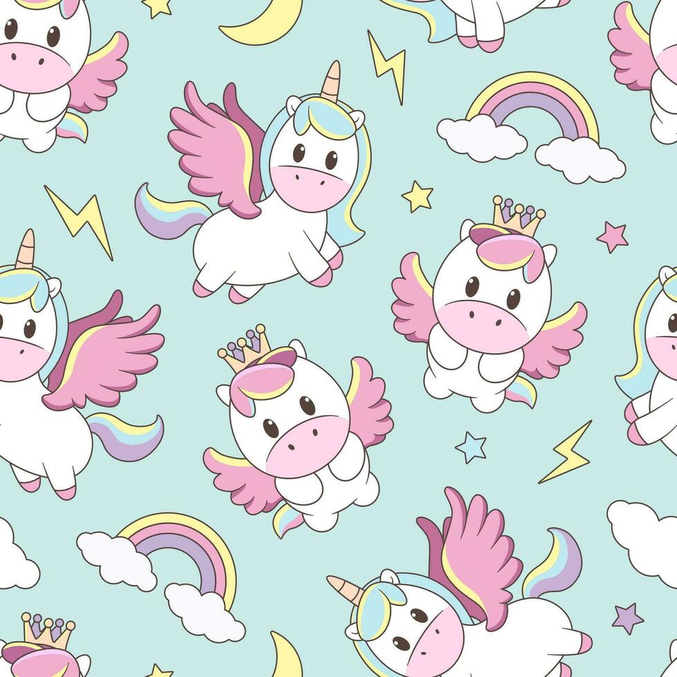 Seamless pattern with magic unicorns, rainbow, stars, moon. Vector tile with cartoon character for childish print, wrapper, textile, print, fabric. Pro Vector