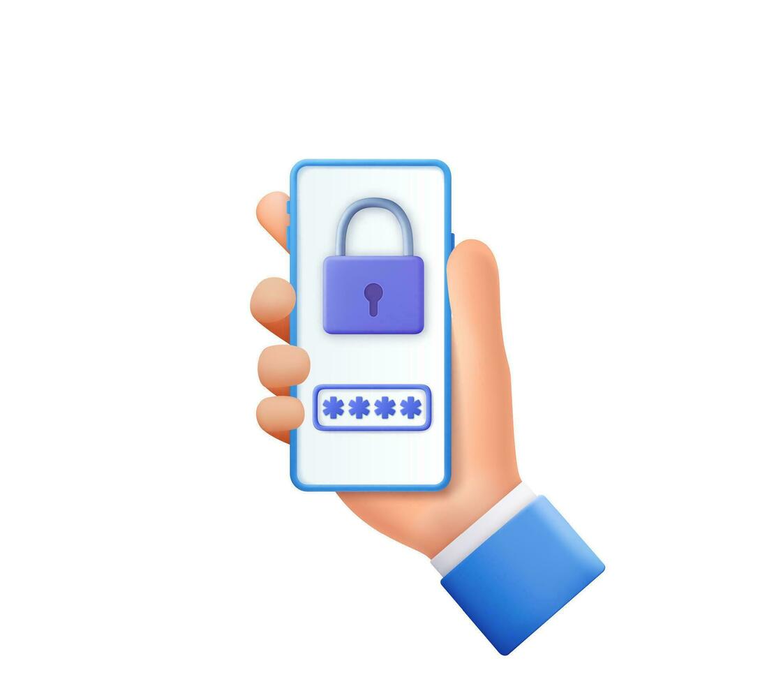 3d hand holding smartphone with padlock and password isolated over white background. Internet security concept. 3d render. Vector illustration Pro Vector