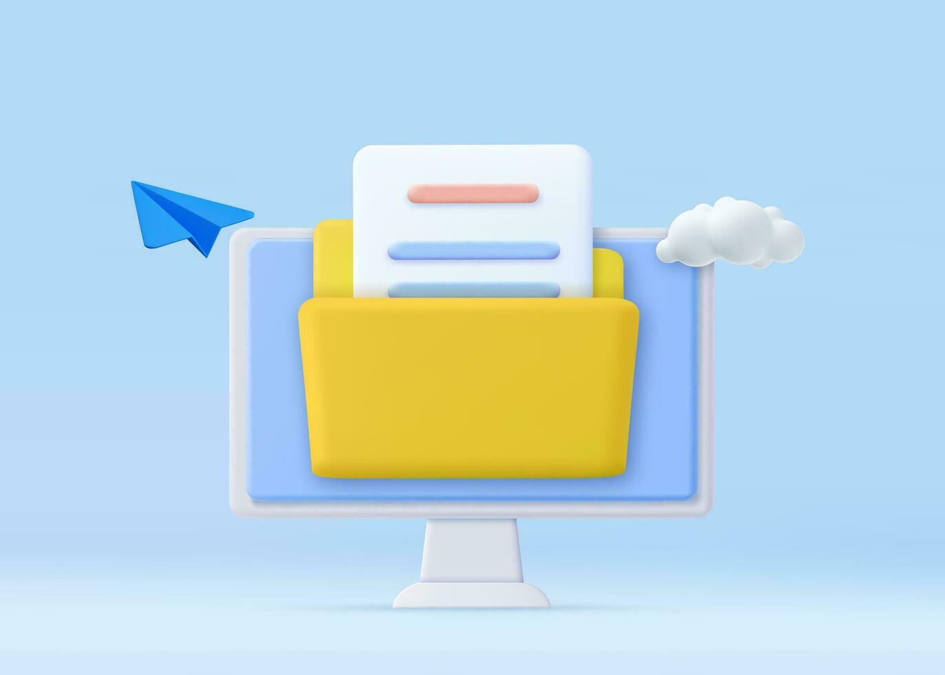 3d File transfer concept. Yellow folder with document on computer monitor. minimal design folder with files, paper icon. File management concept. 3d rendering. Vector illustration Pro Vector