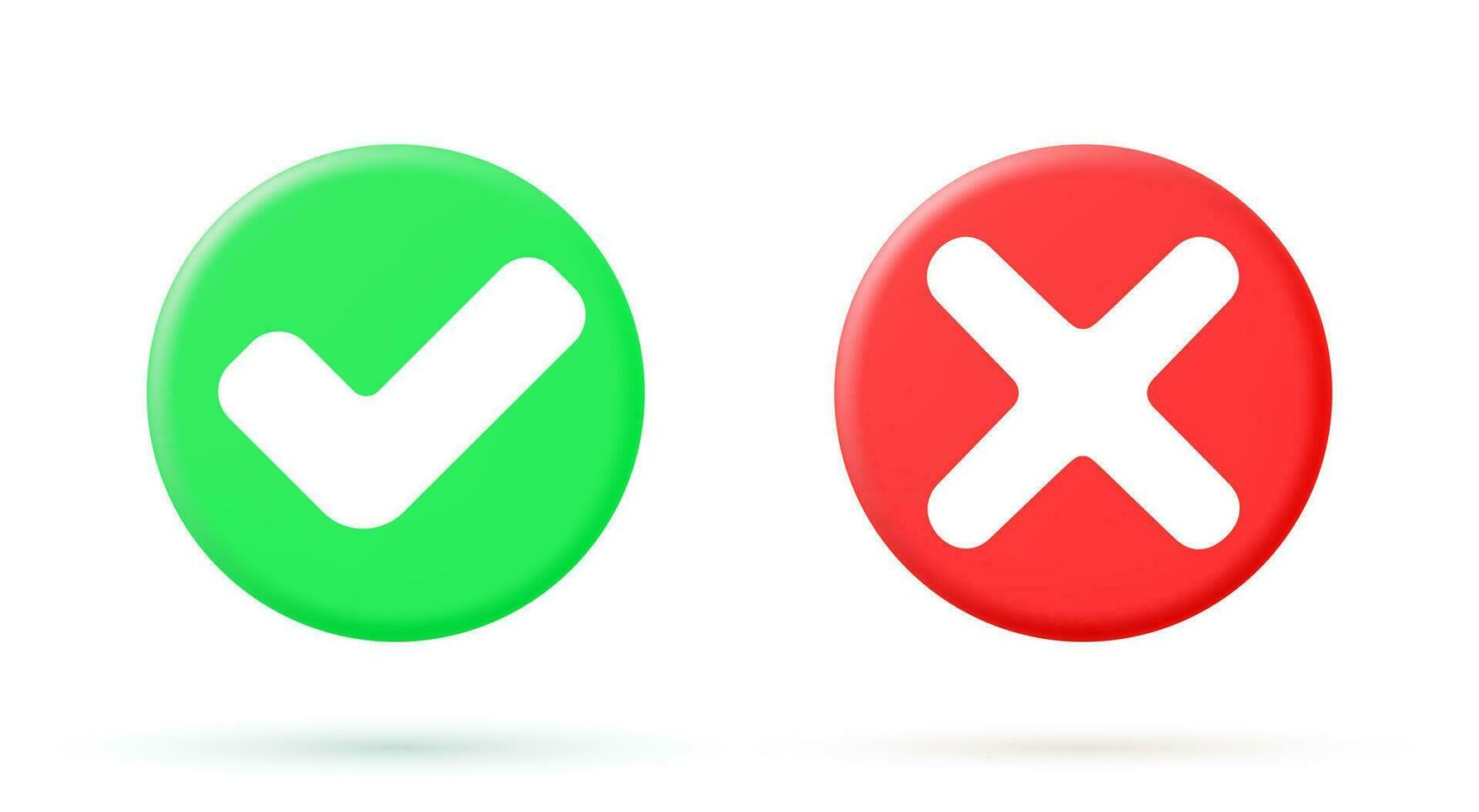 Green tick check mark and cross mark symbols icon element, Simple ok yes no graphic design, right checkmark symbol accepted and rejected, 3D rendering. Vector illustration Pro Vector