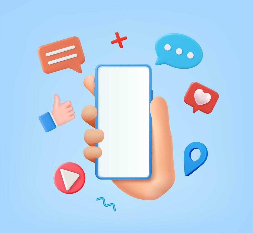 3d render social media and technology with smartphone, like button and geometric shapes, chat. online social communication applications concept. Vector illustration. Pro Vector
