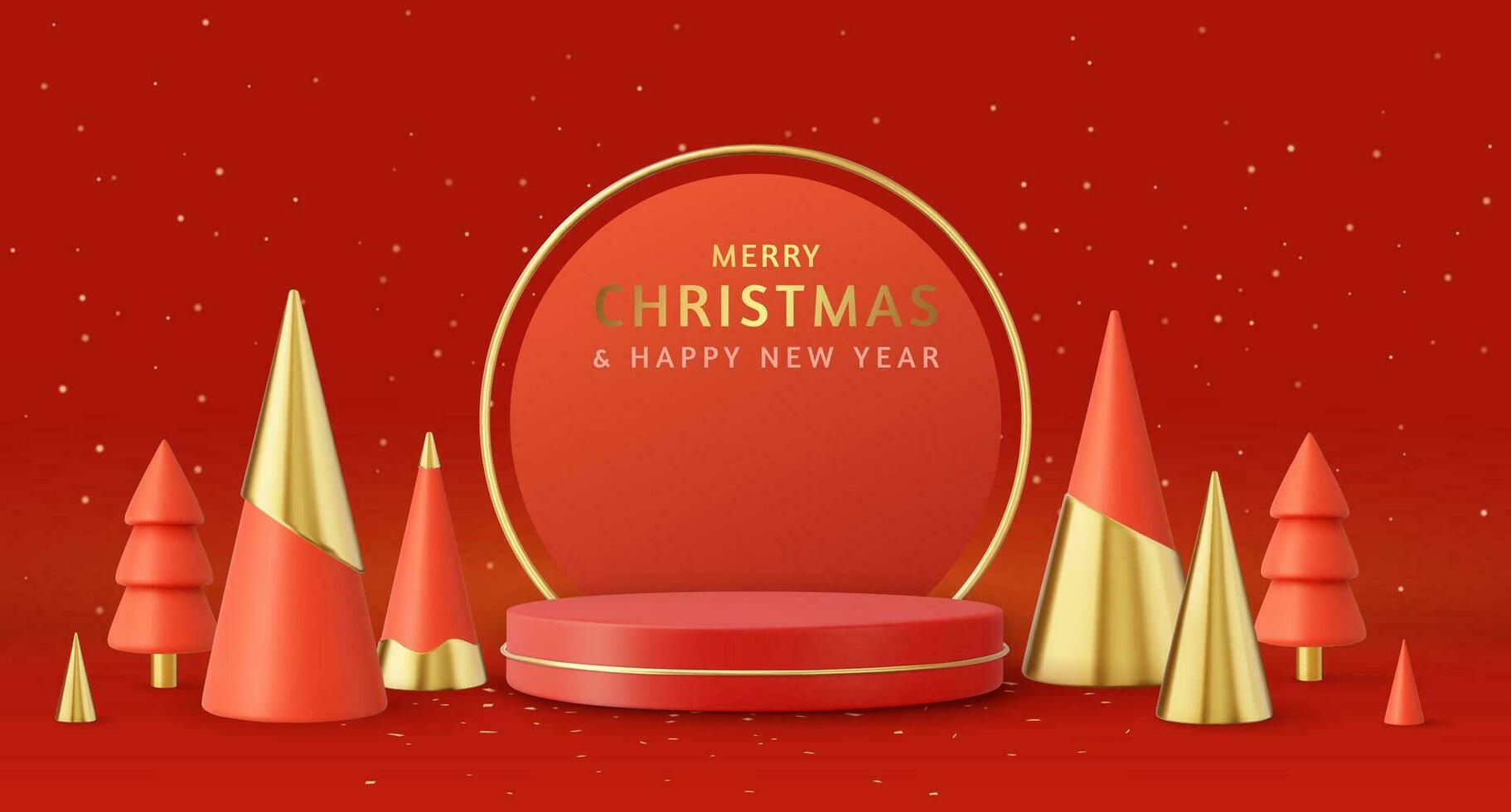3d Christmas and New Year round podium studio with cone trees. Creative holiday template. Xmas winter composition. Banner and web poster. 3d rendering. Vector illustration Pro Vector